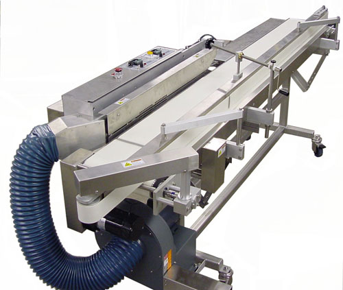 - Angle adjustable all-welded steel or optional Stainless Steel base stand allows tilting of the Conveyorized Sealing System assuring uniform packages.