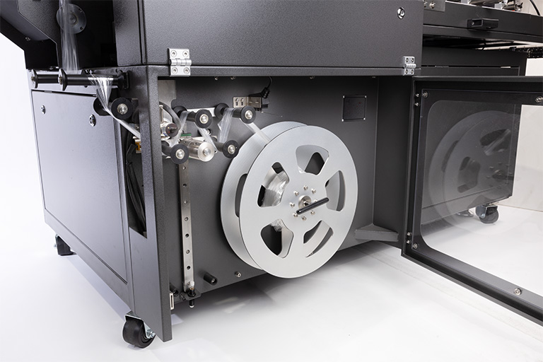 Film tracking wheels keep film in place; scrap film take-up wheel