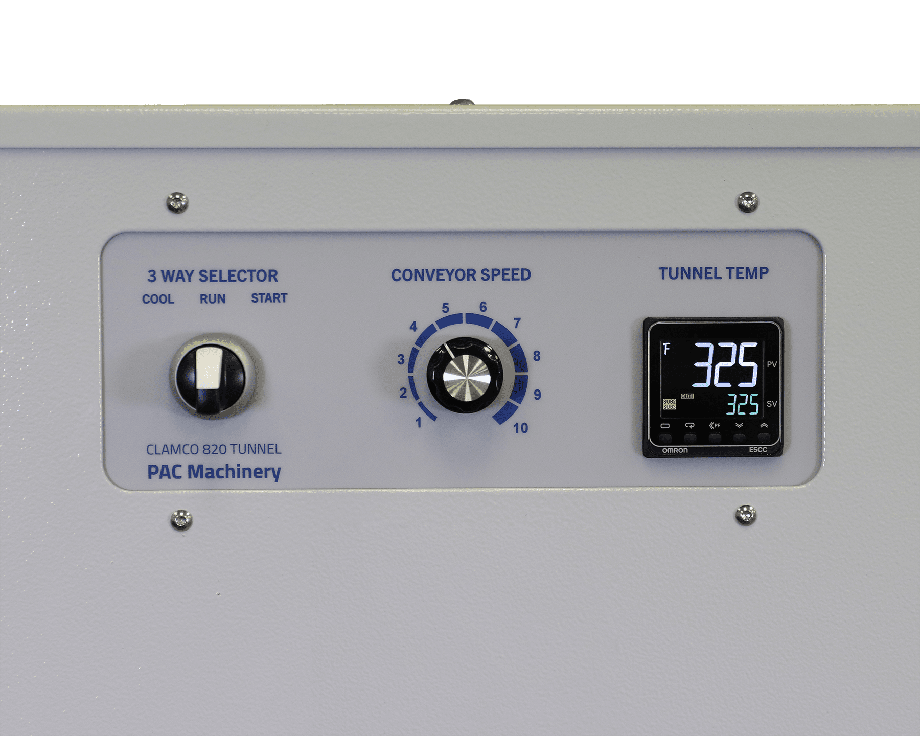 When professional quality packaging is required for smaller production demands, choose the tabletop shrink tunnel that provides complete heating all around the package along with the same cool down safety controls as our larger tunnels. Constructed of heavy-gauge structural steel, the Clamco 820 features a variable-speed PTFE coated mesh belt conveyor, airflow heat transfer, and an automatic cool down timer. A unique advantage in a tabletop tunnel is a riser bar under the mesh belt which lifts the product momentarily for increased airflow from the bottom tunnel to enhance shrink packaging results.