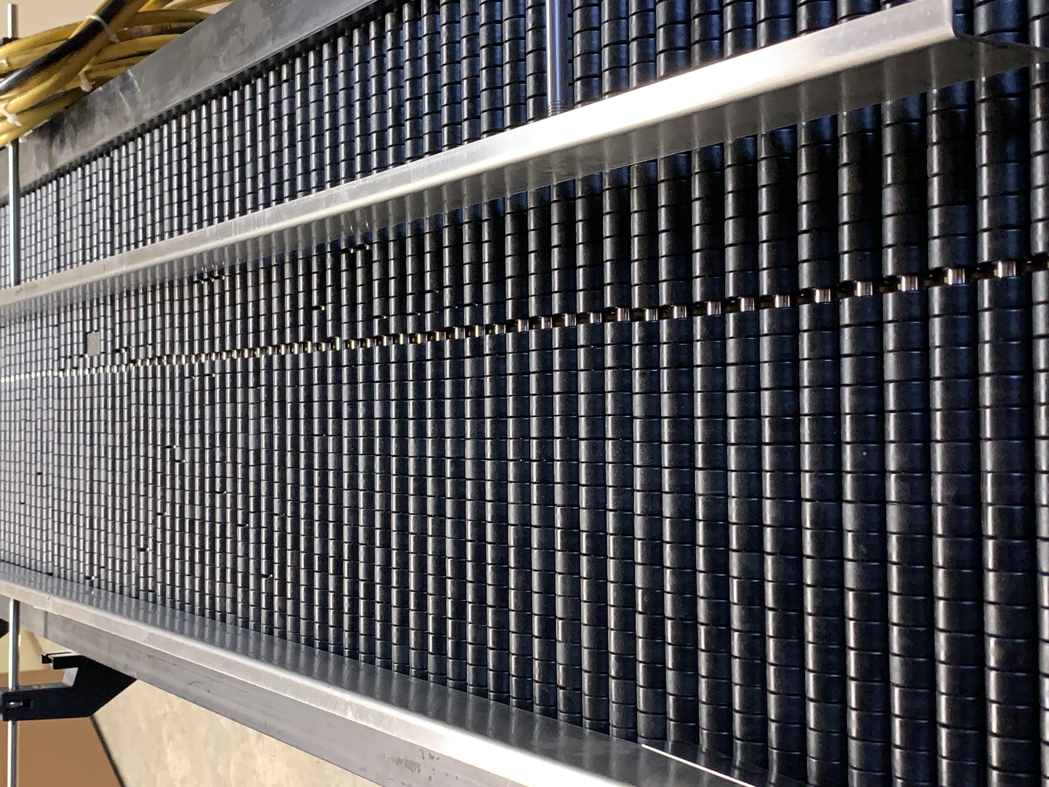 Shuttleworth slip torque roller conveyor for smooth product transfers. Can also be used to feed product from a belt situation and sync to flighted pusher type conveyor