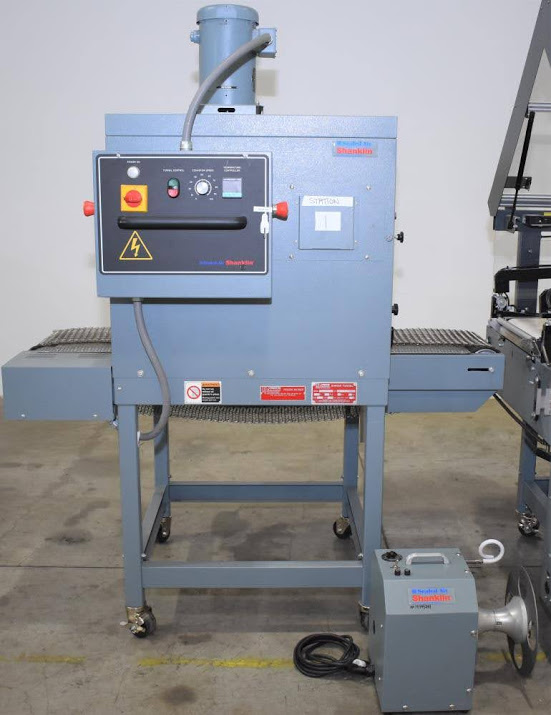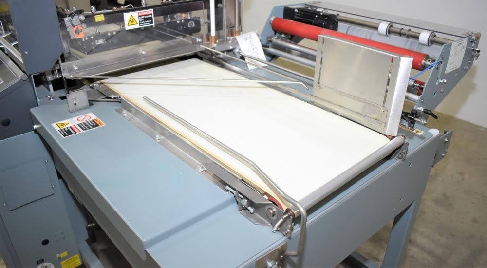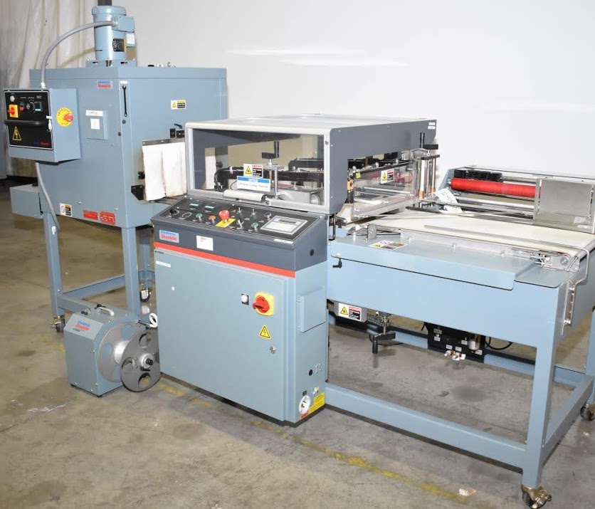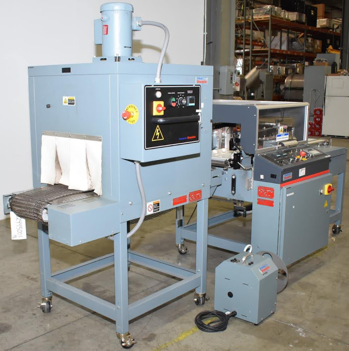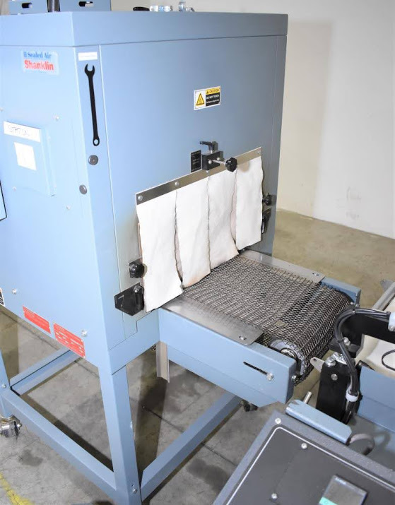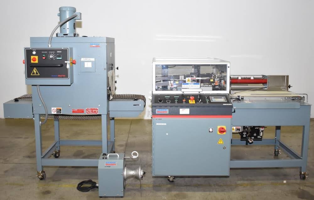 Used- Shanklin Automatic L Sealer, Model A26A, Capable of speeds up to 35 packages per minute. Has a max 26" web width and a max seal area of 22"Long x 18" wide x 5.5" Tall. Allen Bradley MicroLogix 1000 PLC, with variable infeed speeds. Includes a Shanklin Tunnel Model T6H, 22" W x 12 1/2"T x 42" L chamber. 15" Wide, Stainless steel mesh belt.