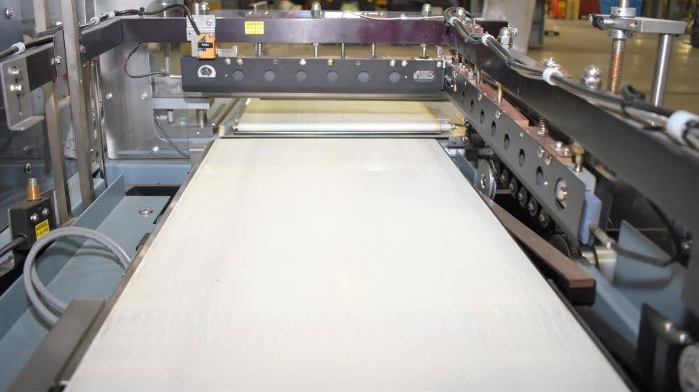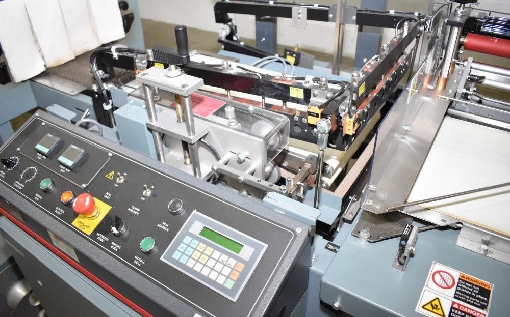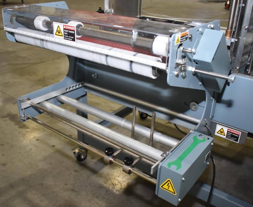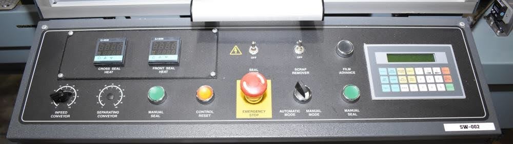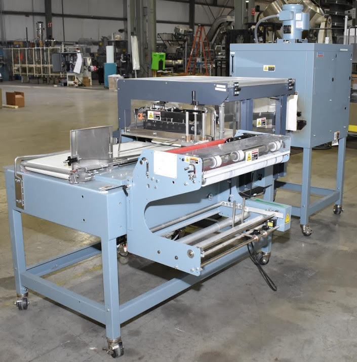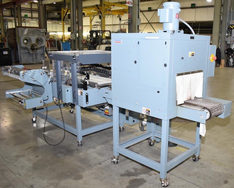 Used- Shanklin Automatic L Sealer, Model A26A, Capable of speeds up to 35 packages per minute. Has a max 26" web width and a max seal area of 22"Long x 18" wide x 5.5" Tall. Allen Bradley MicroLogix 1000 PLC, with variable infeed speeds. Includes a Shanklin Tunnel Model T6H, 22" W x 12 1/2"T x 42" L chamber. 15" Wide, Stainless steel mesh belt.